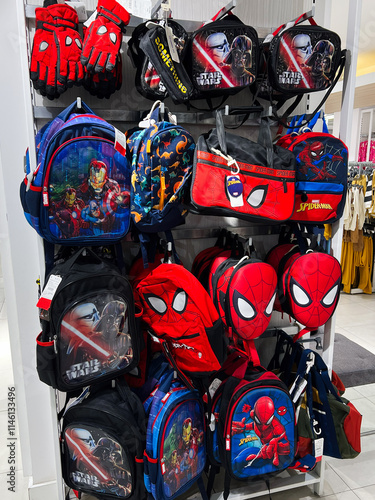 © AS Photo Family, Obraz premium Kyiv, Ukraine - December 18, 2024: Colorful display of superhero-themed backpacks and handbags in retail store setting