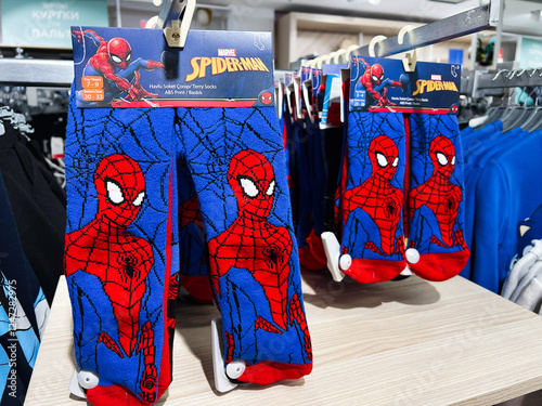 Obraz premium Kyiv, Ukraine - February 05, 2025: Children's socks featuring Spiderman character design displayed in a clothing store
