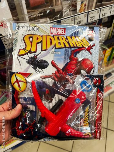 Obraz premium Kyiv, Ukraine - February 04, 2025: Spider Man theme toy set and comic magazine bundled and displayed in a store.