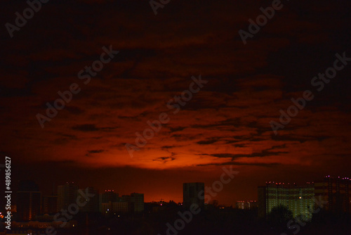 © teal sun, Fototapeta premium Kyiv/Ukraine - 26 February, 2022: The burning sky in Kyiv due to a fire at the Vasylkiv oil depot. Russian troops who invaded Ukraine fired rockets at an oil depot near Kyiv.