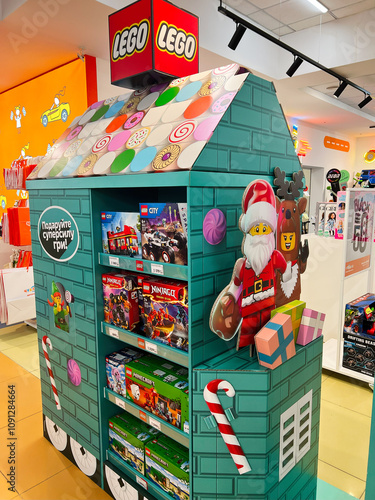 © AS Photo Family, Fototapeta premium Kyiv, Ukraine - November 20, 2024: Festive LEGO display with Santa and reindeer in toy store