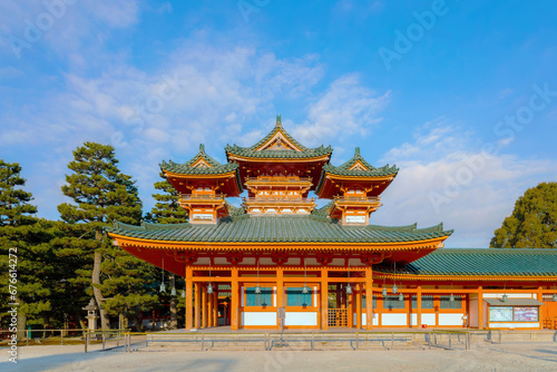 Obraz premium Kyoto, Japan - April 2 2023: Heian Shrine built on the occasion of 1100th anniversary of the capital's foundation in Kyoto, dedicated to the spirits of the first and last emperors who reigned the city