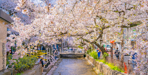 Obraz premium Kyoto, Japan. Cherry blossom trees along the Takase River