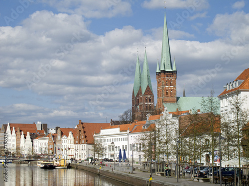 © Ralf Gosch, Naklejka premium Lübeck Obertrave mit Petrikirche und Marienkirche