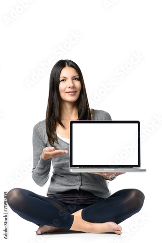 Fototapeta premium Lächelnde Frau hält einen Laptop mit einem leeren Bildschrim