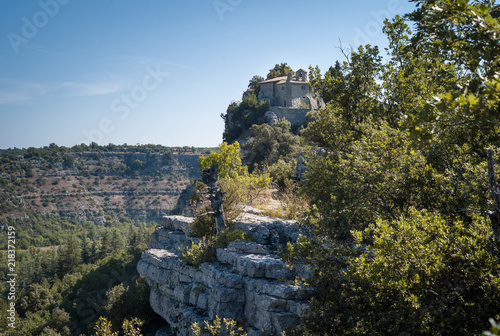 © Photonbleu, Naklejka premium L'ermitage Saint-Eugène est niché au bord d'une falaise dans le Bois de Païolive, près des Vans, Ardèche, FRANCE, 10 juillet 2018