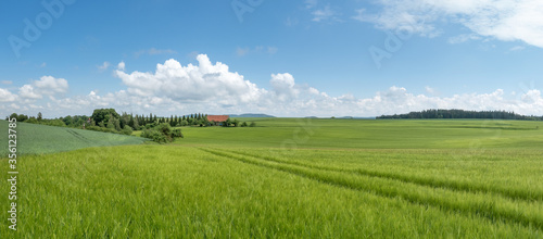 Fototapeta premium Ländliche Szene im Frühling inmitten grüner Getreidefelder in leicht hügeliger Landschaft