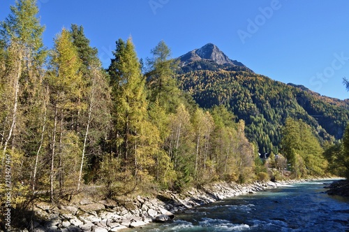 © hachri, Fototapeta premium Längenfeld im Ötztal mit Fluss Ötztaler Ache, Wald, und Berg Blockkogel im Hintergrund, Österreich