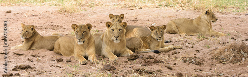 © Sibylle, Naklejka premium Löwenfamilie im Sand ausruhend, Panorama