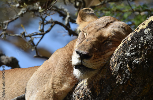 © dieter76, Obraz premium Löwin schläft auf Akazie