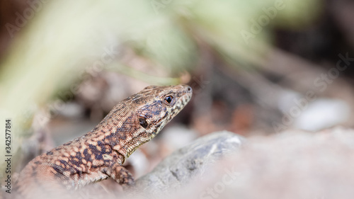 Naklejka premium Lézard des murailles, rapiette, se promenant sur le sol au milieu de la verdure en macro