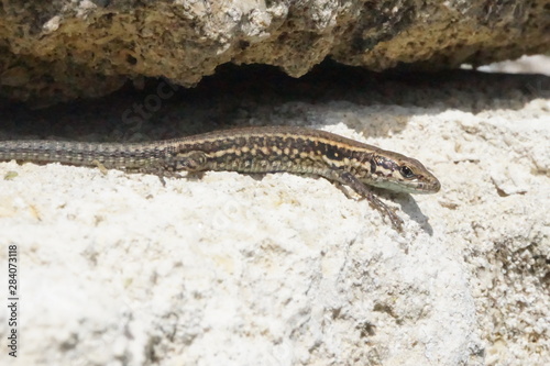 Obraz premium lézard des murailles sortant d'un rocher - reptile