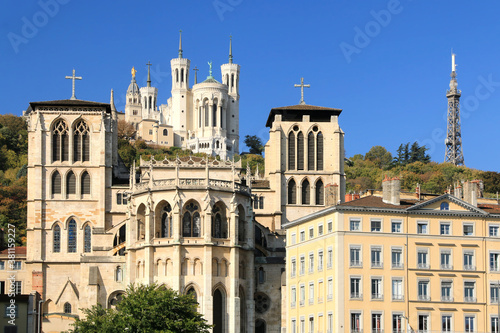 © lamax, Fototapeta premium La blanche basilique de Fourvière au dessus de la cathédrale Saint Jean à Lyon.