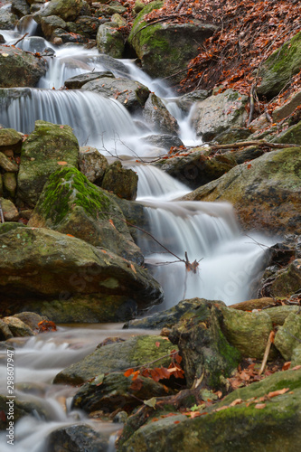 © balenabianca, Fototapeta premium La cascata tra le rocce del bosco in autunno