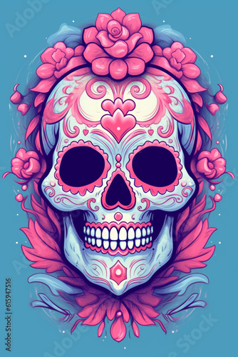 © Michael, Fototapeta premium La Catrina dia de muertos Skull. Bemalter Schädel in rosa blau. Tag der Toten in Mexico. Hochkant. Hochformat. Generative Ai.