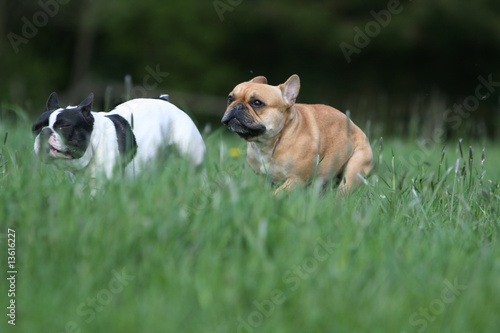 © Dogs, Obraz premium la course entre deux bouledogues français dans le jardin