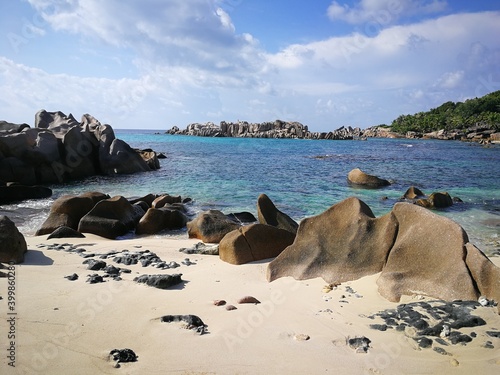 © ivva100, Obraz premium La Digue island beach with cliffs in Seychelles