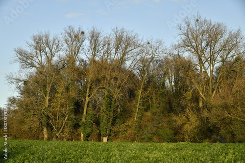 © Photocolorsteph, Fototapeta premium La forêt en automne au bout d'un champ sous un ciel bleu à Marche-Lez-Écaussinnes (Soignies)