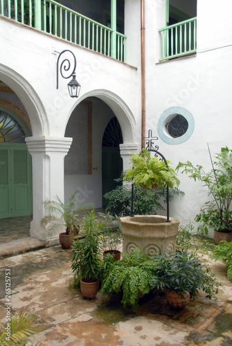 Fototapeta premium La Havane, Casa de Obispo, cour intérieure et puit en pierre avec plantes...