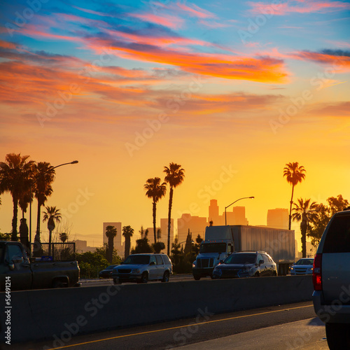 Naklejka premium LA Los Angeles sunset skyline with traffic California