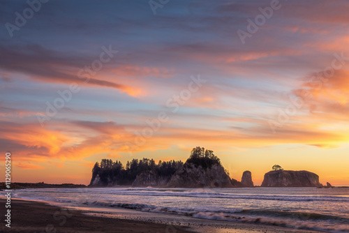Fototapeta premium La Push beach at Olympic National Park, Washington, during sunset. Waves roll...