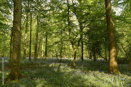 Fototapeta premium La végétation dense au sol à l'ombre ou au soleil sous les feuillages des hêtres à la forêt du Hallerbos près de Halles