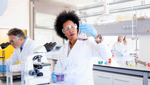 © PeopleVideos, Obraz premium Lab specialists working at the lab and examining some samples on the microscopes