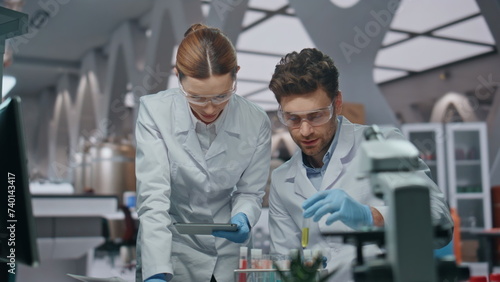 Obraz premium Lab workers experimenting samples looking at computer data in clinic close up