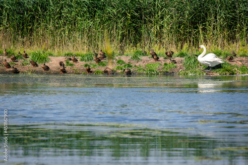 © rpetryk, Obraz premium łabędź i kaczki na brzegu wśród trzciny