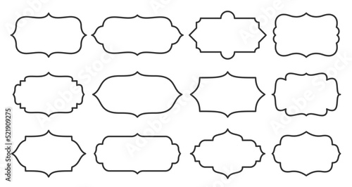 Fototapeta premium Label set, different shape, line style. Contour frame for text about product, sale info, certificate, blank, card. Empty sticker template for jar, container, bottle, pack. Outline retro border design