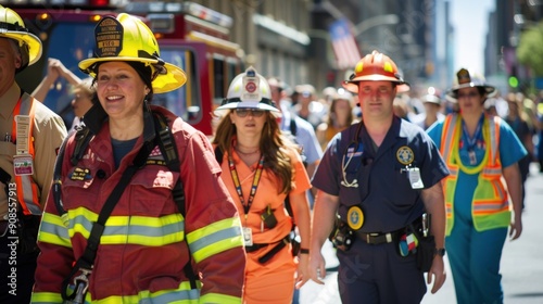© Rustam, Obraz premium Labor Day parade featuring people in professional attire representing their careers, walking proudly down a city street.