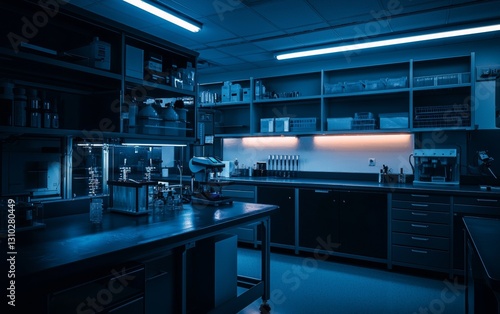 © Stanislau, Fototapeta premium Laboratory interior showcasing advanced equipment and glowing blue lighting during nighttime exploration