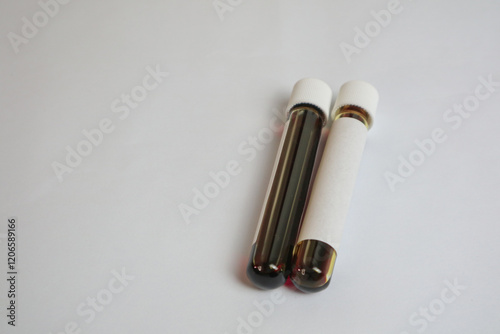 © Rudy, Fototapeta premium Laboratory worker's hand in rubber glove holding test tube with blood sample on light background with space for text