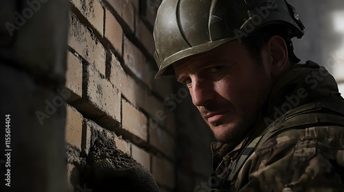 © NusratJahan, Obraz premium Laborer laying bricks at construction site in industrial setting with close-up view