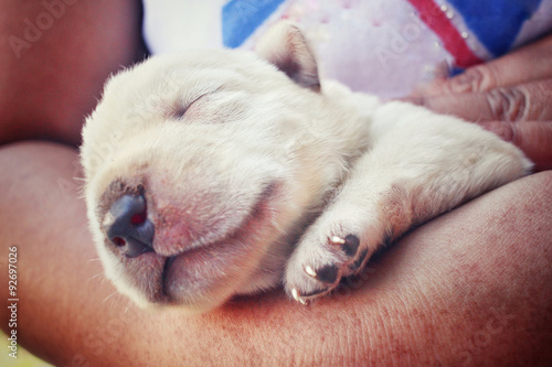 © Mumuuphoto, Fototapeta premium Labrador puppy sleeping on hands