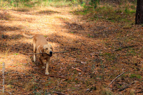 Fototapeta premium Labrador retriever walking in the pine forest at autumn