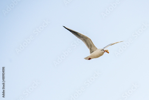 Obraz premium Lachmöwe mit Brot im Schnabel beim Flug über der Ostsee in Polen