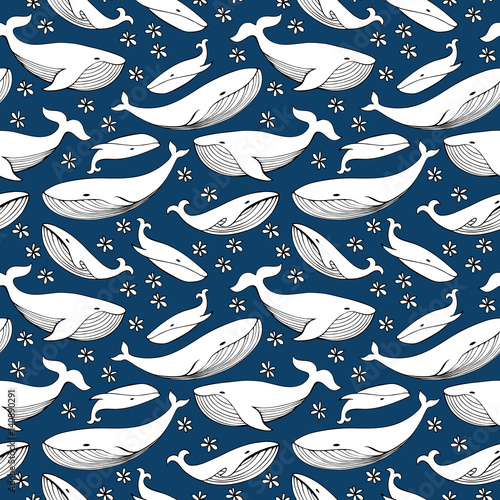 Naklejka premium Ładny ręcznie rysowane wieloryby. Monochromatyczny wektor wzór.