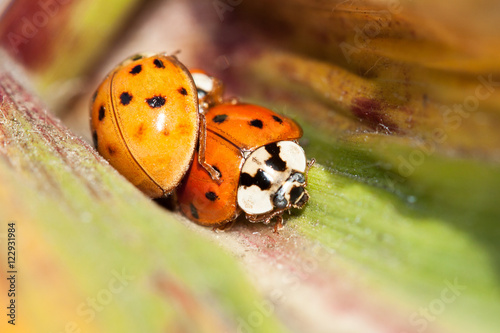 © Fotikphoto, Obraz premium Lady bugs on a green leaf.