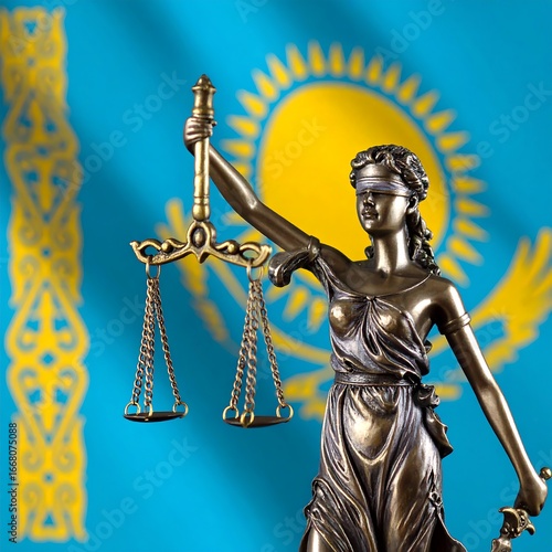 Obraz premium Lady Justice statue, Kazakhstan flag backdrop