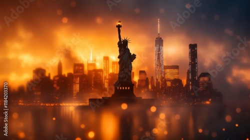 © Priyanut, Obraz premium Lady Liberty's Neon Embrace: A City's Night Glow