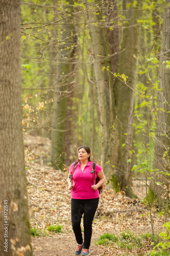 © Alejandro, Fototapeta premium Lady looking at tall trees while hiking in the forest.