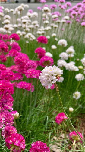 © K5K, Obraz premium Lady's cushion (armeria) blooms in white, amidst a vibrant garden