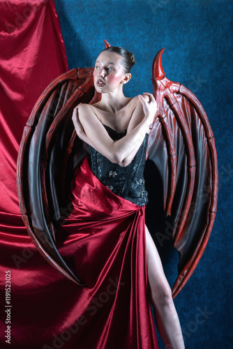 © Dmitrii, Fototapeta premium lady with dragon wings on red and blue background