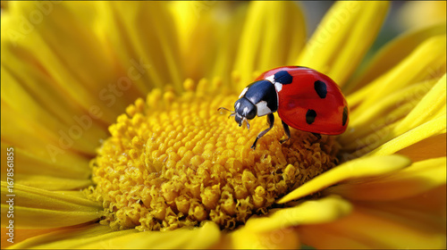 © Nattapol, Fototapeta premium Ladybird on bright yellow flower close up macro nature