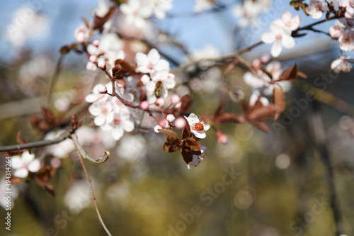 © Nanette, Obraz premium Ladybug and bee on a cherry blossom