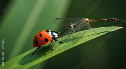 © Alleuy, Fototapeta premium Ladybug and dragonfly on grass blade