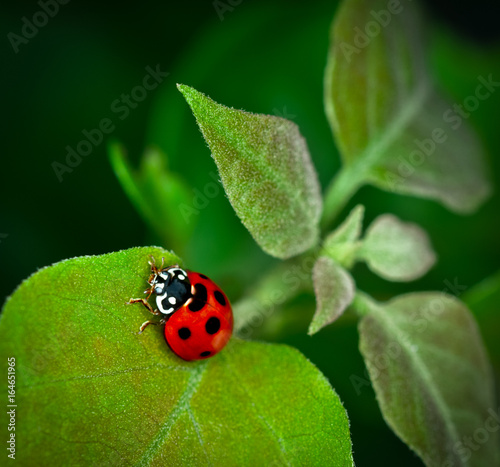 Obraz premium Ladybug climbing on green leaf