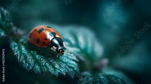 © Thares2020, Fototapeta premium Ladybug crawling on a vibrant green leaf with intricate details and lighting