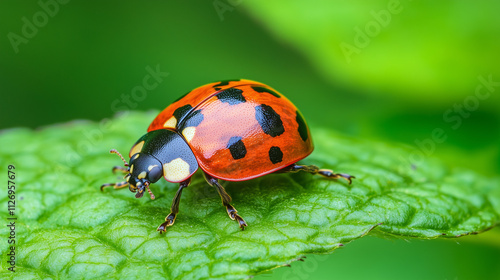 © Elena, Naklejka premium Ladybug crawling on fresh leaf with lush green background